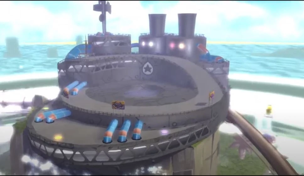 Once again devoid of any colour but colour pools. A series of rope bridges cross over a large green colour pool. It is an industrial area with docks, ships surrounded by ink and machinery are everywhere. There is a hotel up on a hill near the cannon. In the middle, there is a central area filled with small statues of Black, crates and forklifts. This can be destroyed using a supercharge power - up. The way to the cannon is blocked by cliffs, which can be cleared by a transformation engine.